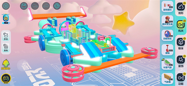 为方便操作,在正式开始搭建前,需将设置中的编辑视角更改为【上帝视角】。在机关中找到“齿轮”并拖出,即可实现“齿轮”摆放的基础操作。除了正常的摆放外,还可以点击【旋转】将“齿轮”旋转至竖起,也可以调整【缩放】调整“齿轮”大小及侧面的宽度。待尺寸设置完毕后,点击左侧【复制】按钮,即可批量复制已调整好的组件,达到节省时间、提高效率的效果。