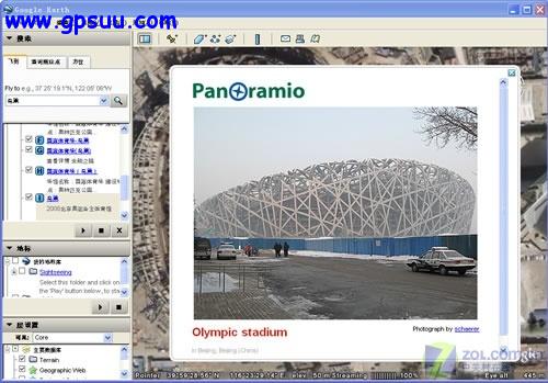 打开goole earth界面,在左侧搜索框输入“鸟巢”,它便自动定位并将我们带到这著名的奥运场馆,其渐行渐进的3D效果令人折服。