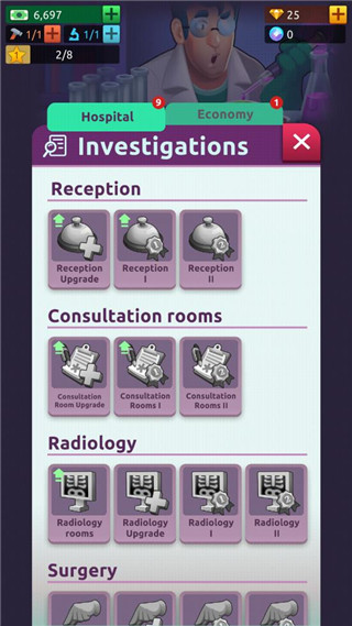 一个有价值的医院需要实施不同的科室,如放射科、创伤科、医务室、急诊室,甚至是配备齐全的候诊室。当然还有最好的手术室!明智地再投资您的收入,以改善您场所内的所有区域,并快速做出决定,为越来越多的患者提供服务