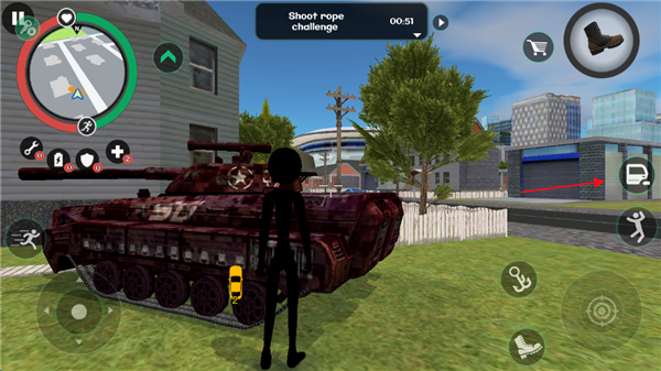 1、这个红色的角色就是你所操控的角色,可以快跑,跳跃,也可以扔出绳索,可以挥拳和腿踹,围绕这个游戏的名称,绳索这个东西就是这个角色的灵魂,它的作用非常的大,可以对静态物品(座椅,栏杆,骑车等)造成大量伤害和击飞效果。