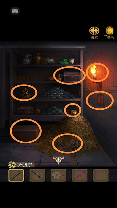 13、进密室,太暗了,我掏出火折子(还好刚才用完没丢了)把墙上火把点了,映入眼帘就是好多钱!