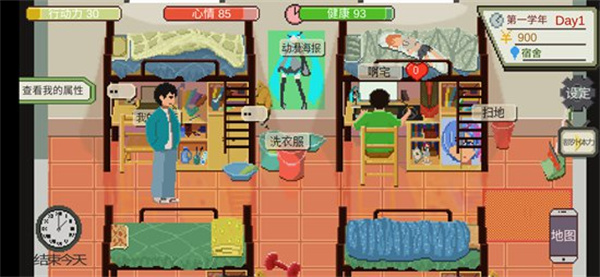 8、退出桌面,可以看到自己的宿舍,我们有一个名叫“啊宅”的室友,大家可以跟阿宅聊天打游戏,可以获得好感度,后续会给我们一定的帮助。另外也可以洗衣服、拖地,来增加自己的健康值。