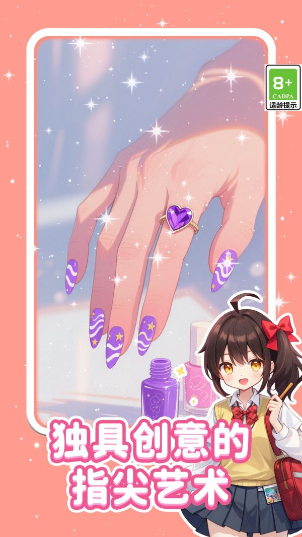1、从修剪指甲形状、打磨甲面,到涂抹底油、上色以及装饰点缀,完整复刻现实美甲操作步骤,沉浸式感受美甲全过程。