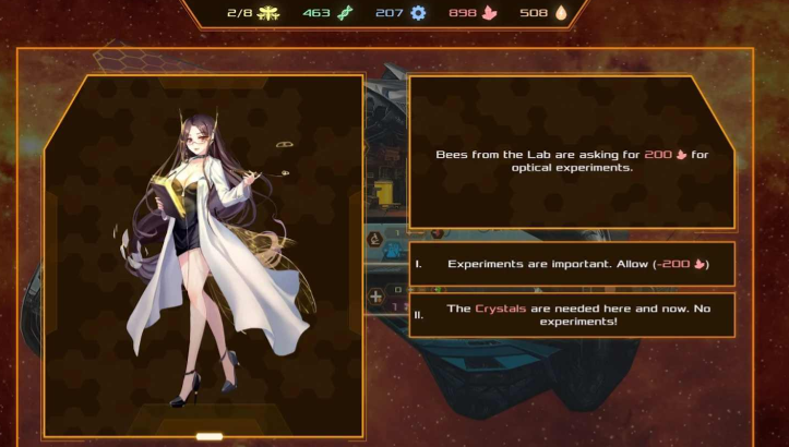 你是“梅利斯塔”(“星星蜜蜂”)的指挥官,你拥有一群智能的拟人蜜蜂。你的船是你的家,你的任务是密切关注其击退敌人攻击的战斗能力;保持航线并有效地收集资源,以确保蜂王和士兵蜜蜂都有足够的食物;当然,还要密切关注你的船员的状况,其成员努力惹上麻烦或安排麻烦。