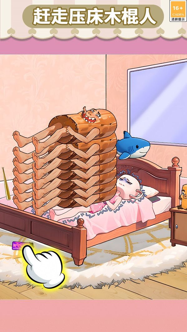 1、进入 “赶走压床木棍人” 类关卡,观察场景内可互动道具,选择合适物品(如驱赶工具),通过点击操作达成赶走木棍人的目标。
