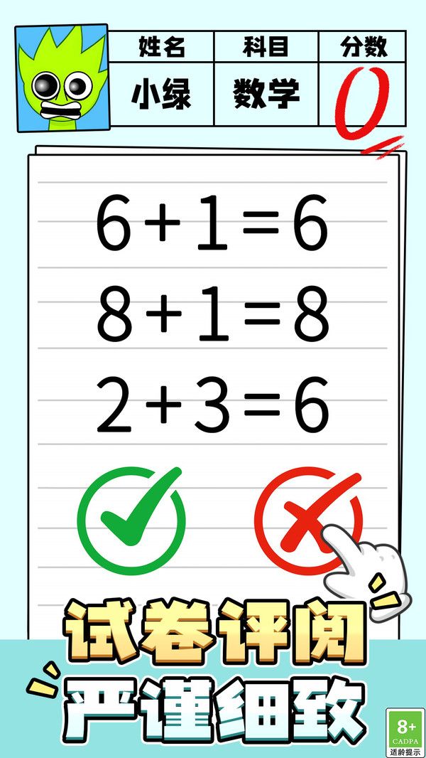 2、加入 “试卷评阅” 场景,玩家化身老师判断题目对错,从解题者转变为评判者,带来角色身份切换的新鲜体验。