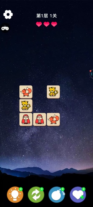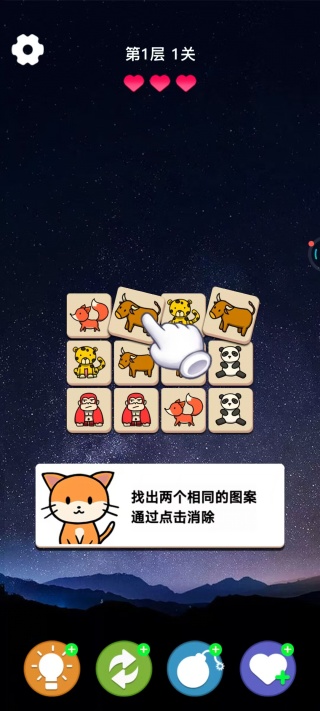 1、进入游戏从第一关开始,找出两个相同的图案,点击进行消除