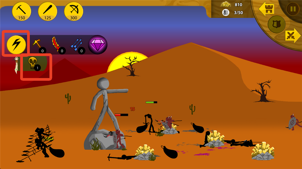 5、购买成功后可以点击战场上左边闪电形状的按钮,然后再选择底下黄色骷髅。