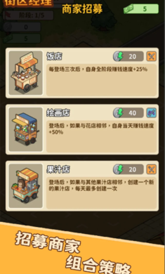 1、独创邻里联动机制,特定商铺相邻时自动触发收益加成或顾客共享效果。