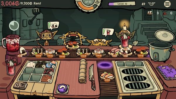 3、及时为到店的哥布林顾客上菜,根据顾客反馈调整寿司制作与食材选购策略,积累收益用于解锁新寿司品类与拓展店铺。