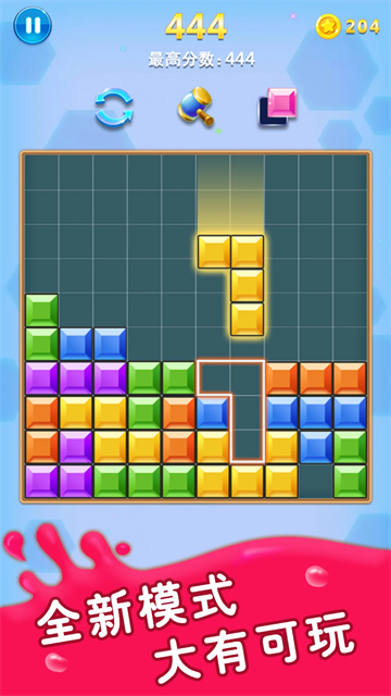 1、拖动模式:将3个备选方块拖放至任意地方,拼成完整的行或者列即可消除得分,无空间放置方块时,游戏结束