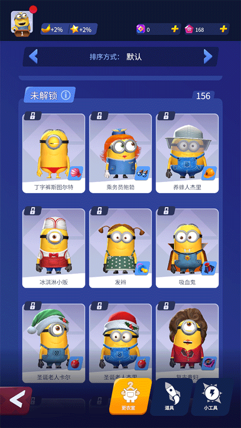2、在“小黄人赛跑”模式中,你可以选择自己喜欢的套装出战(套装技能在这个模式中暂时无法使用),当然也不要忘记刚刚加入的全新角色卡尔和杰里哦!选择好出战角色后,就会来到装备小工具界面,在这里你可以将有着各种各样功能的小工具加入背包中。