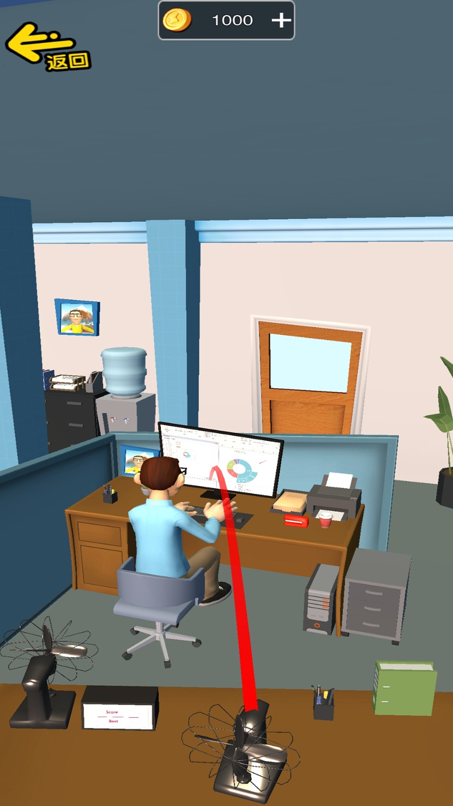1、在办公室场景中快速观察,锁定身边可利用的物品,如订书机、风扇等,为整蛊做好准备。