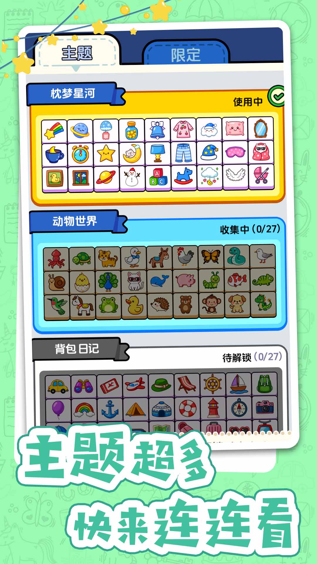 1、以经典连连看玩法为基础,创新加入主题解锁与收集系统,让传统消除游戏更具可玩性与探索性。