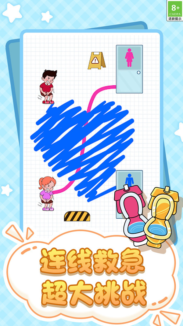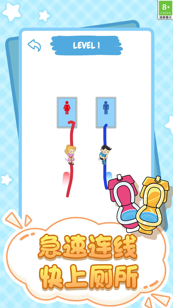 1、玩家通过手指滑动绘制连线,为小人规划从起点到厕所的路径,确保路径不被障碍阻断,成功连通即可完成当前关卡挑战。