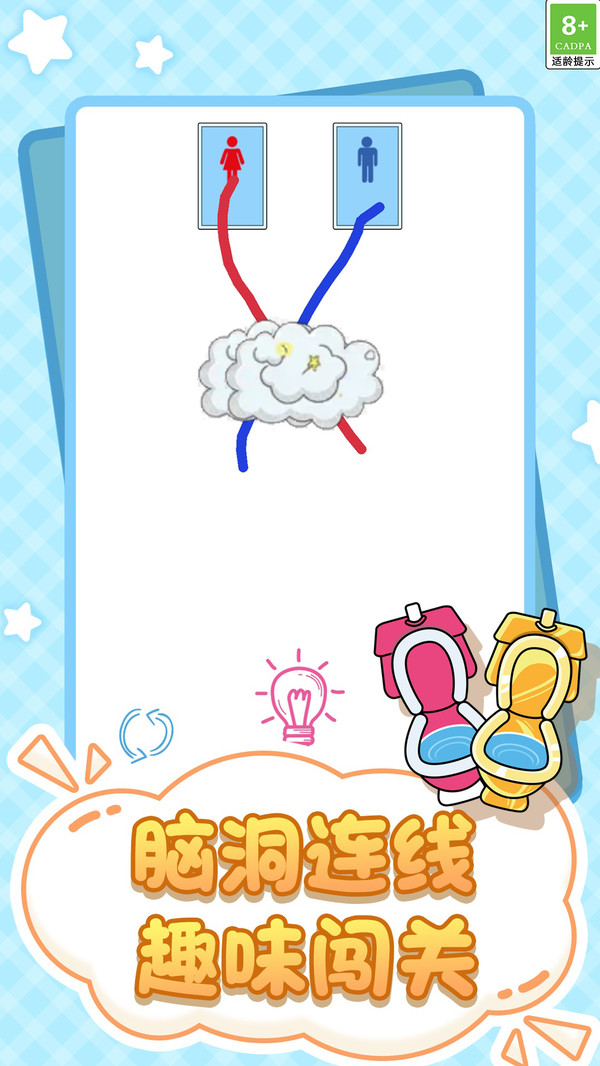 1、开始每关前先观察小人与厕所的位置,以及中间的障碍分布,在脑海中大致勾勒出可能的连线路径,再逐一排除不可行的路线。