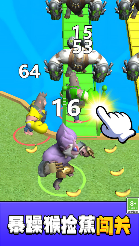 2、在奔跑过程中尽可能多地收集香蕉,积累分数并可解锁新角色和特殊道具。