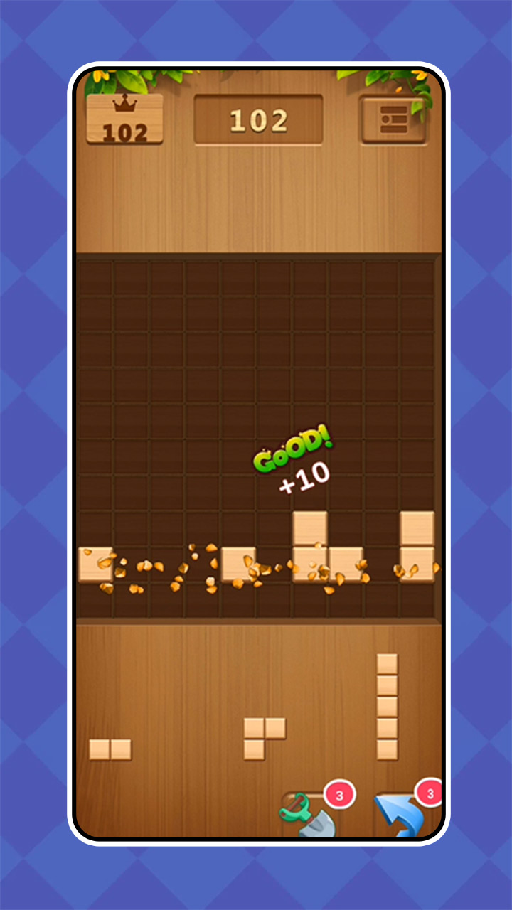 2、当玩家成功将方块放入格子后,如果形成了一整行或一整列,这些方块就会被消除,并且玩家会获得相应的分数。