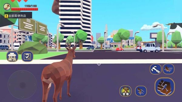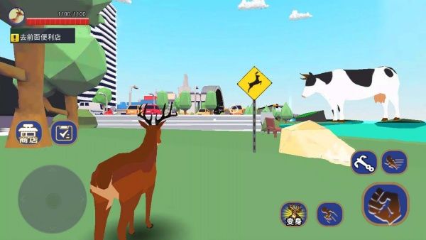 1、操控鹿在城市中移动,利用左侧拉杆控制方向,右侧按键实现站立、拳击、跳跃等动作,开展破坏与冒险。