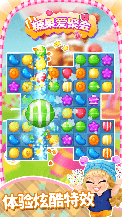 2. 特效糖果组合系统,不同特效糖果组合可以触发全屏清除等震撼的消除效果。