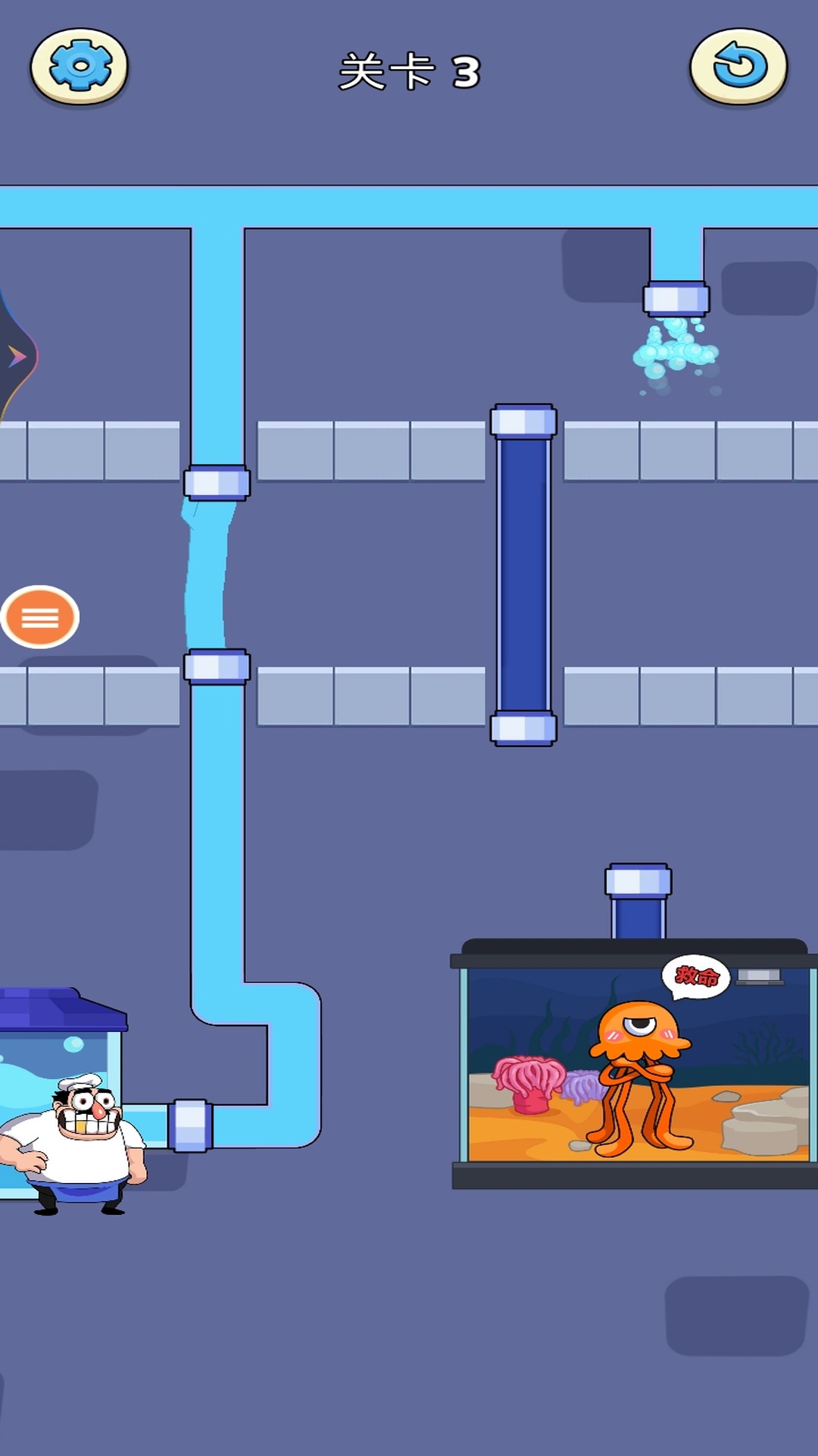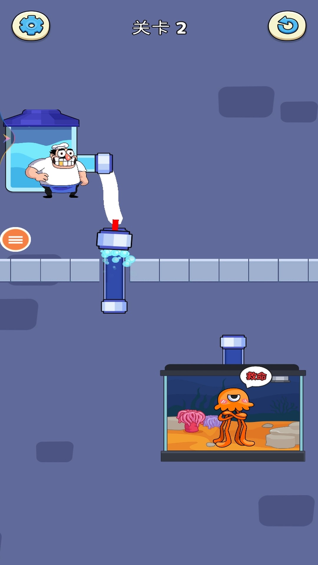 1、水流中断或泄漏,分析问题所在并重新调整管路,直至水流无阻输送,成功为章鱼解决洗澡难题,完成关卡挑战。