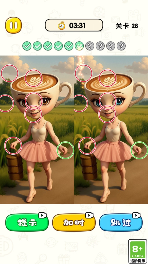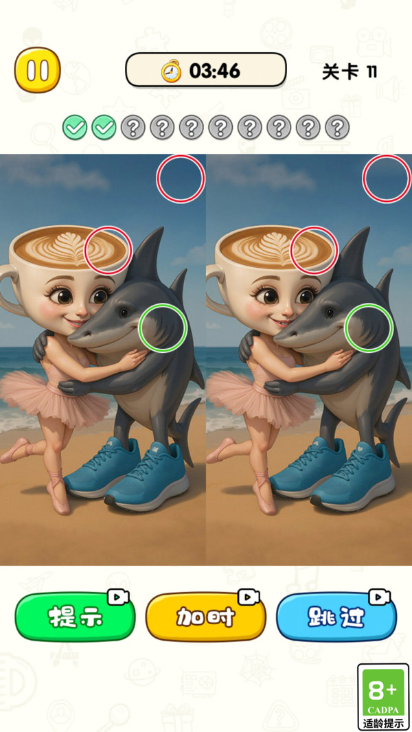 3、成功找出所有差异即可通关,解锁下一关;若时间耗尽仍未找齐,可选择重试或使用道具复活,继续挑战。