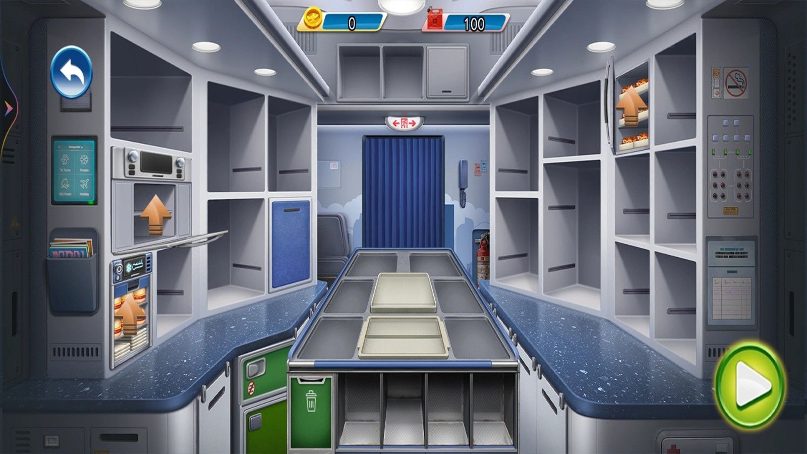 2、游戏场景细节丰富,飞机内的座椅、舷窗、厨房设备等元素还原度高,能让玩家直观感受高空烹饪的独特环境,增强沉浸感。