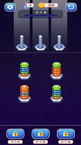 3、随着关卡推进,逐步应对更多数量、更复杂色彩组合的螺母排序,挑战自身规划能力。