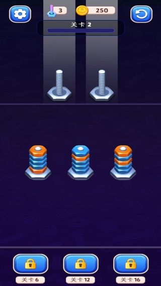 1、初入关卡时,先清点当前需整理的螺母数量与颜色种类,明确目标排序方向,避免盲目操作浪费时间。