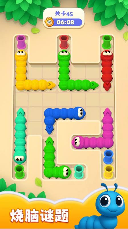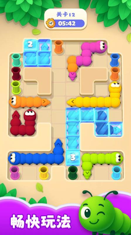 3、让蠕虫顺利到达与其颜色对应的线轴,并触发缠绕动画。