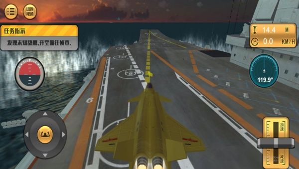 1、接收任务指示后,驾驶舰载机从航母升空,根据导航前往目标区域,在规定时间内完成对未知敌舰的侦查任务。