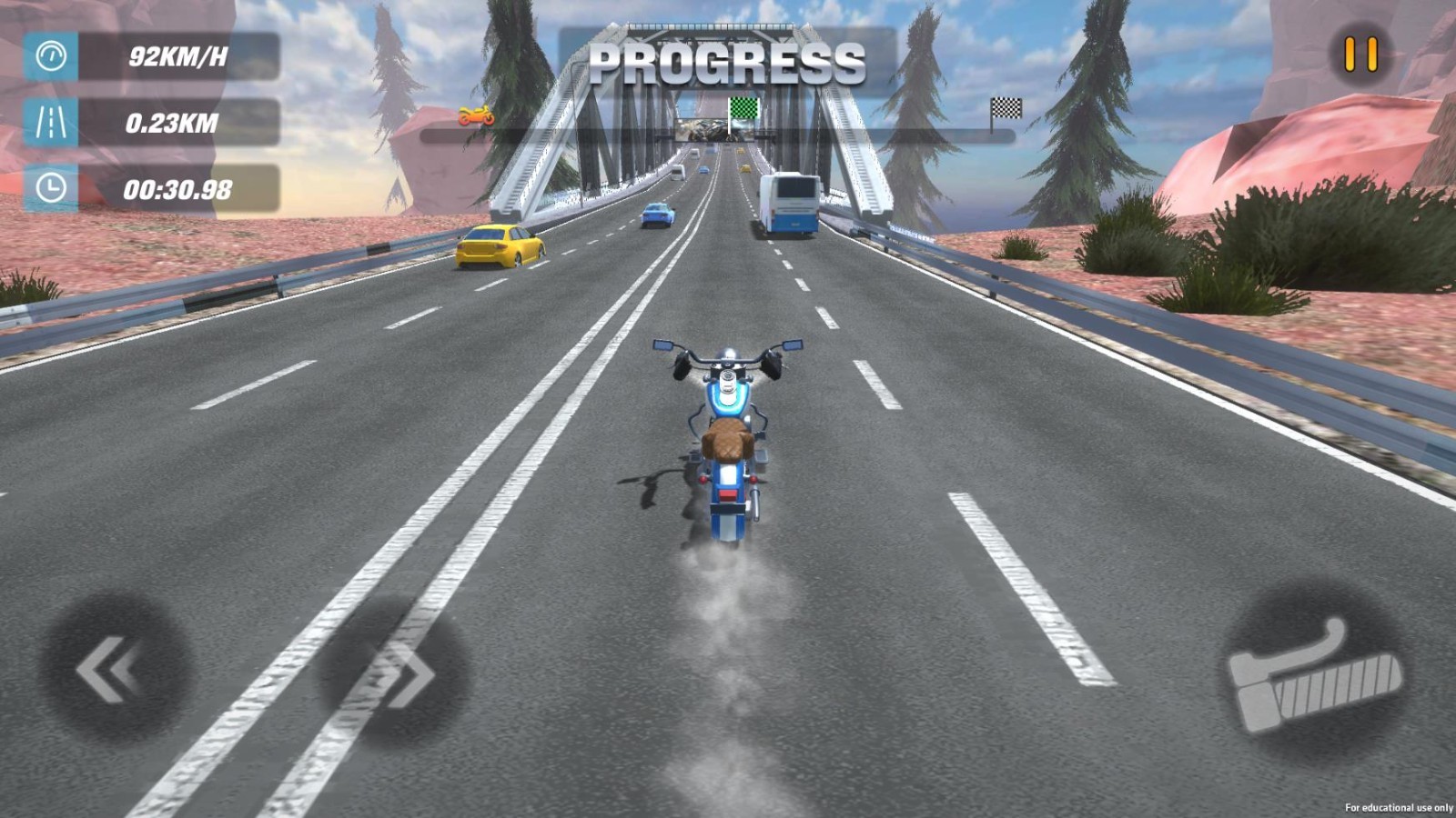 1、熟练掌握驾驶技巧:在屏幕左侧,设有虚拟摇杆,用于操控摩托车的行驶方向;屏幕右侧,则布置了加速、刹车以及氮气加速等功能按键。此外,通过左右倾斜手机,能够模拟现实驾驶过程中身体重心的转移,进而使操控更为精准。