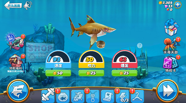 2、商店系统:饥饿鲨:世界有商店系统,玩家可以购买装备和道具以提升自己的鲨鱼。
