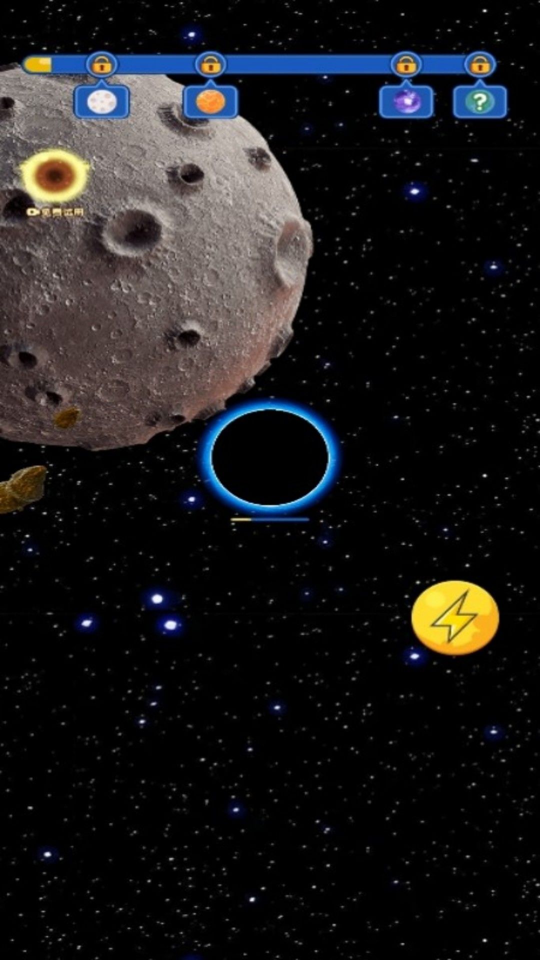 3、应对竞争与限制,若遭遇其他黑洞,根据双方体积差距决定策略;遇到 “体积过大” 的物体,标记为后续成长后的目标,转向其他可吞噬物体。