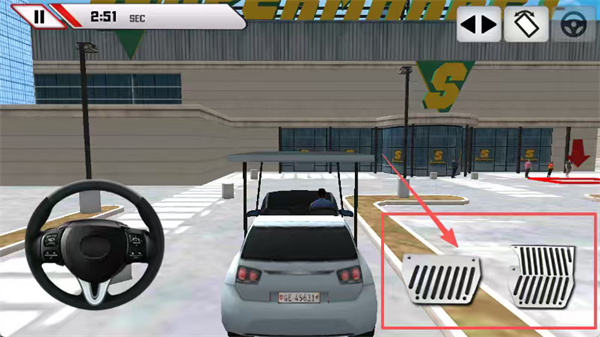 4、驾驶操作界面中,使用左下角方向盘控制方向,配合右下角油门和刹车踏板操控浅蓝色汽车,完成商场停车等指定任务。