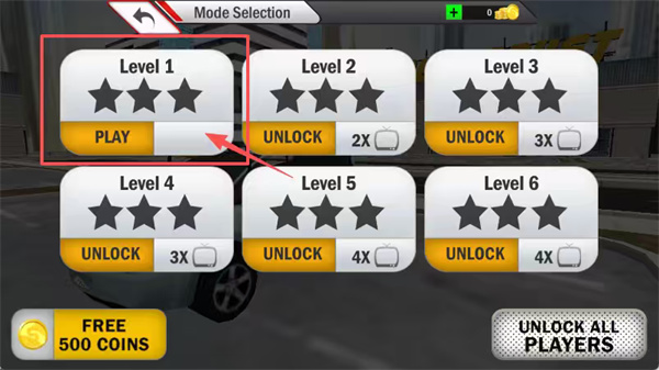 2、在模式选择页面,点击中央大型红色"PLAY"按钮启动游戏,左下角黄色按钮可领取500金币奖励,右下角设有订阅赚取金币选项。