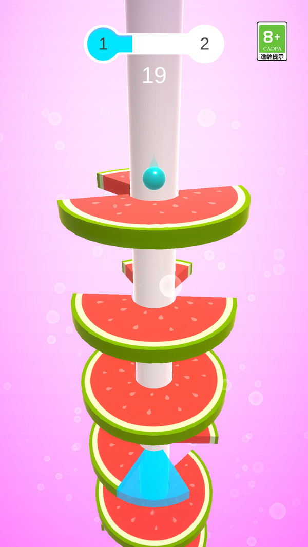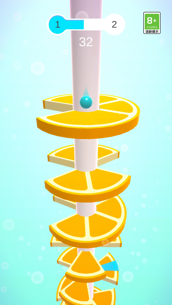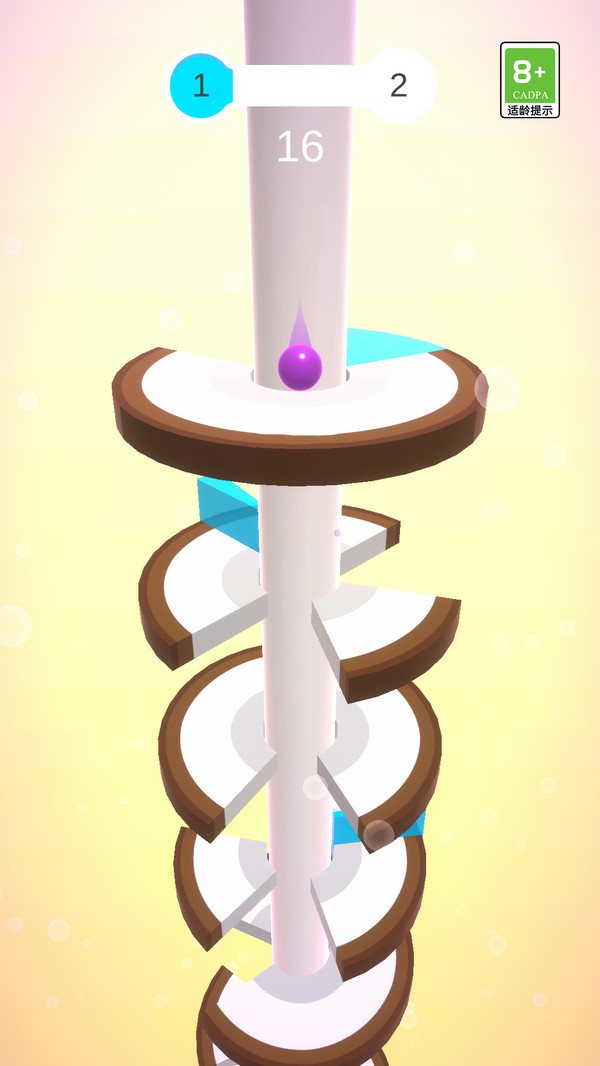 1、操控小球从螺旋塔顶部向下跳跃,灵活避开塔身各类障碍物,持续向下推进,直至抵达塔底完成挑战。