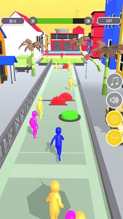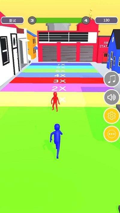3、在游戏过程中,用手指控制蓝色小人躲避后方的红色小人。靠近彩色区域可以获得倍数加成,帮助你更快地积累分数。