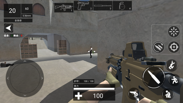 2、操控角色在室内场景移动,利用墙体、桌椅等障碍物掩护自身,寻找敌人位置,根据武器特性选择近战突袭或远程射击。