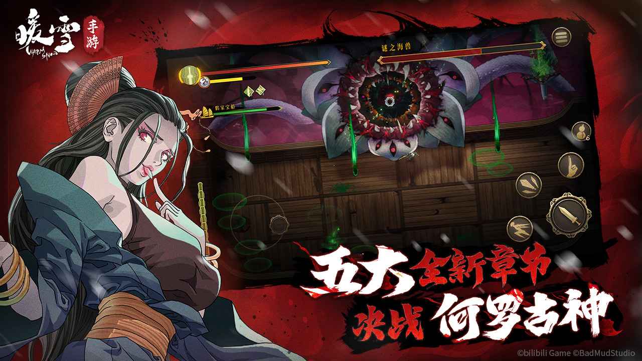 作为一款肉鸽游戏,游戏选择以传统东方元素为设计灵感,并未疏于对故事的打磨,开场动画、不时出现的 NPC、场景设计也时刻围绕着这个世界观展开。虽说文本量和叙述确实不如《哈迪斯》般庞大深刻,但胜在剧情单刀直入不做谜语人,一开场就交代了世界观和 boss 们,给玩家非常明确的目标:踏上旅途,战胜“四大家族”,寻找天降“暖雪”背后的真相。