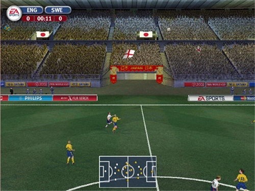 从《FIFA94》算起,《FIFA2002世界杯》已经是EASPROTS的第十一部作品了。整个FIFA系列一直在电脑足球游戏领域扮演着“老大”地位,每一作都是足球游戏FANS们的必玩之作。在经历了《FIFA2001》的失败后,EASPROTS又推出了《FIFA2002》和《FIFA2002世界杯》,可以这么说,从《FIFA2002》开始起,EASPORTS便抛弃了以前的游戏风格,开始向KCET(KONAMI)的《实况足球.胜利十一人》系列(WE系列)学习。玩过《FIFA2002》的玩家都有感触,整个游戏由于明显有一种想学习《实况足球》的风格,反而弄得原有的游戏风格荡然无存,让一些老玩家深感不适。虽然画面是强化了,不过在球感的把握上,EASPORTS仍显稚嫩;虽然人物的动作看起来非常的逼真,但是玩家一旦操作起来,便感到操作的僵化。