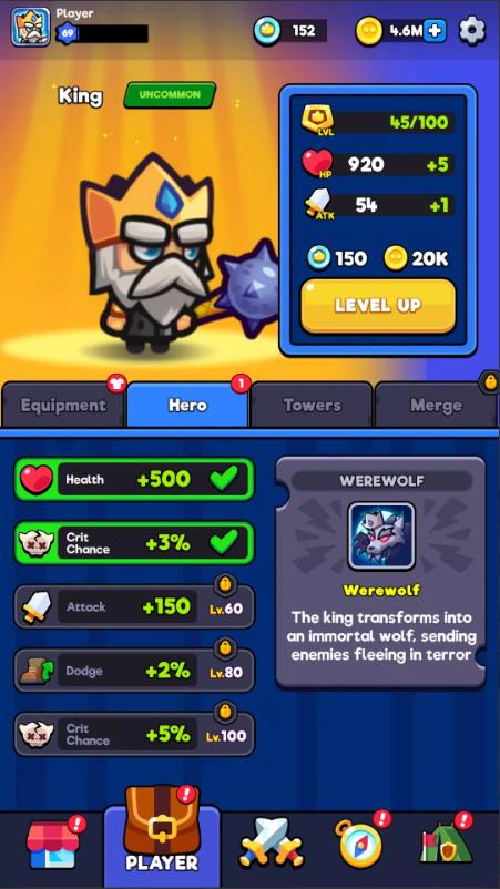 1、经典塔防与角色养成相结合,玩家不仅布置防御塔,还能培养英雄并使用国王技能改变战局。
