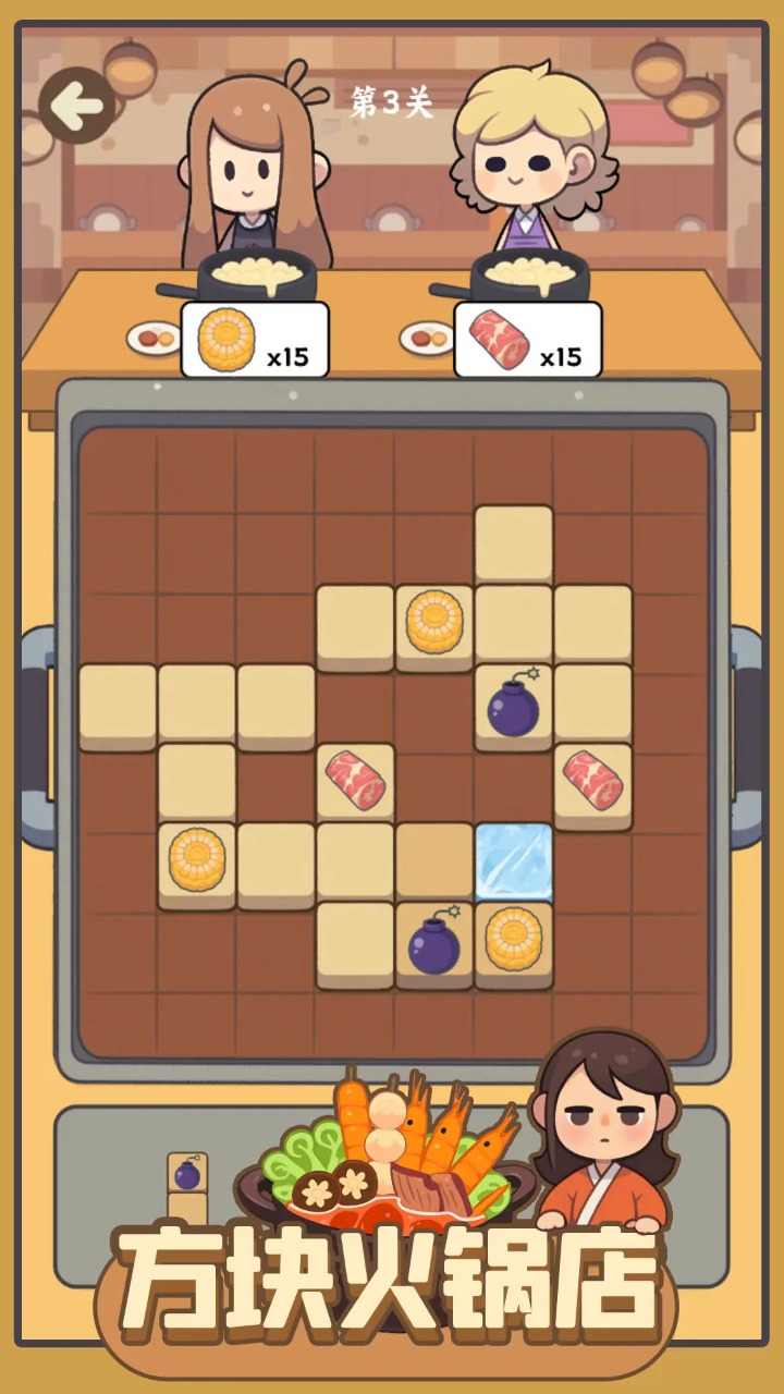 这是一款消除方块经营火锅店的游戏,游戏中玩家需要根据顾客需要的食材摆上积木,消除整行或整列的方块,满足顾客即可获得奖励升级店铺,把小店经营的越来越火爆吧。