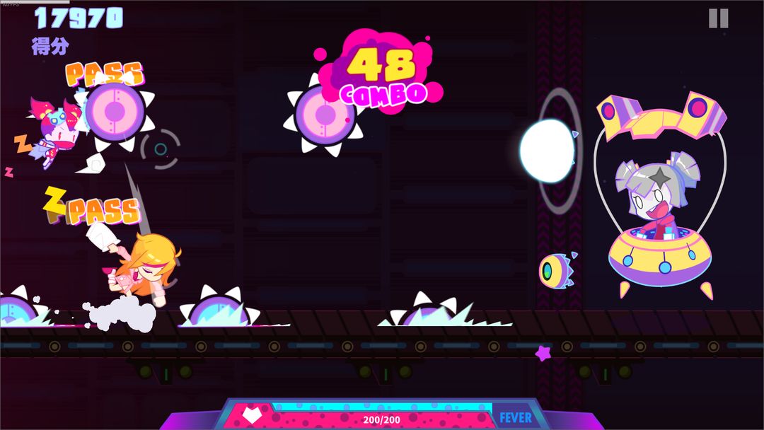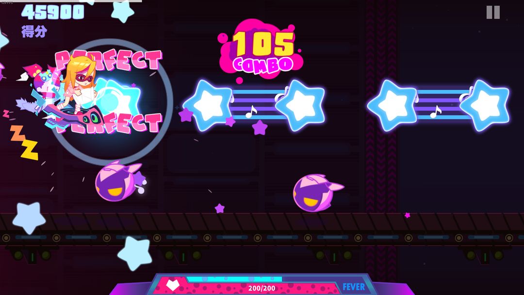 关于我们muse dash喵斯快跑游戏由PeroPeroGames开发的音乐节奏游戏,被定为带有动作要素的音乐节奏游戏,游戏初始就包含了30首歌曲并会按照玩家等级逐级开放可用,每首歌曲至少有两个相当于容易和中等的难度,部分歌曲有需要完成中等难度并达标后才会解锁进阶的难度。玩家选择歌曲和难度后开始游戏,游戏角色会显示在游戏舞台上奔跑,玩家需要点击萤幕左右或上下部分的控制键位,控制角色按照歌曲音乐节奏来上下打击扑面而来的怪物获得分数、躲避舞台地面的轮锯陷阱、收集生命或分数道具;部分时刻怪物会突然冲近角色,需要快速交错点击控制键位将其击退或连击;击打怪物,即节奏点时,会根据准确程度给予分数或造成角色生命伤害,累计一定打击分数后会进入一段时间的加分时间,击打获得的分数会相应提高。歌曲顺利完成或生命值为零时结束游戏,结算分数和获得游戏全域成就,并获得玩家等级经验值,每首歌曲和难度也有单独的成就。玩家等级升级时会给予一定量的游戏道具,需要按照音乐节奏点击萤幕控制游戏角色打击怪物。