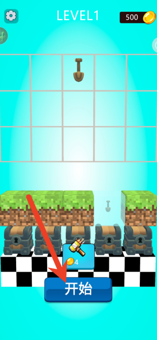 1、进入游戏后首先点击开始按钮,观看铲子自由下落的过程,用基础铲子瞄准并消除场景中的砖块,熟悉游戏的基本操作方式和界面布局,开