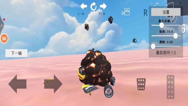 1、玩家可以闯关之前自由选择车辆,驾驶车辆穿越不同类型的道路,汽车会撞击各种物体。