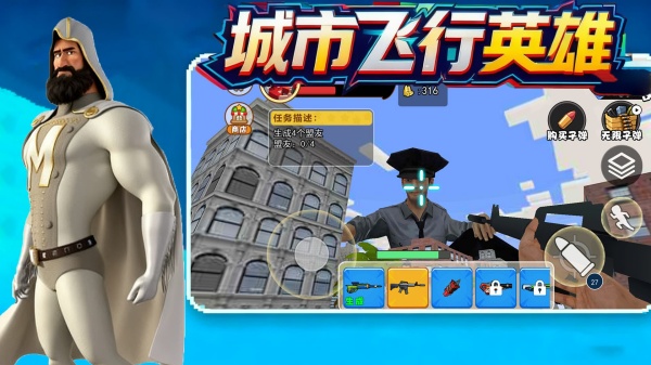 城市飞行英雄是一款非常好玩的动作游戏,在游戏中玩家将成为城市的守护英雄,自由使用超能力在城市中穿梭,解决民众出现的各种问题,快速打击所有犯罪组织,在商店中能购买各种类型的武器,开启精彩的战斗任务,玩家需要清理城市中所有黑暗势力。