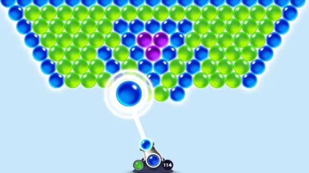 1.玩家控制底部的发射器,向上方发射彩色泡泡,三个或以上相同颜色的泡泡相连即可消除;