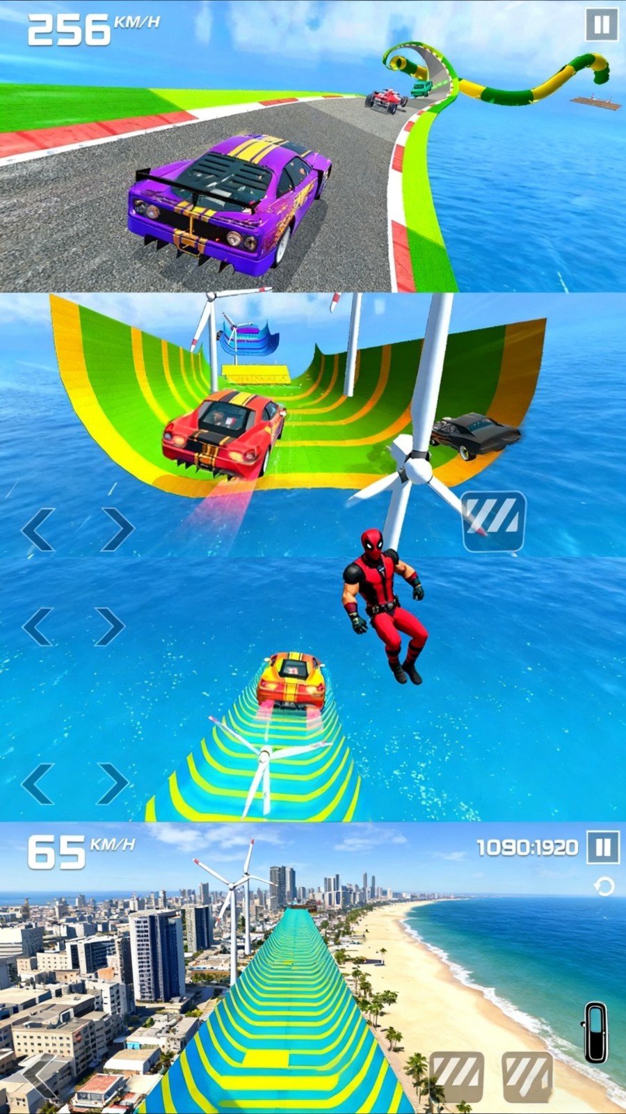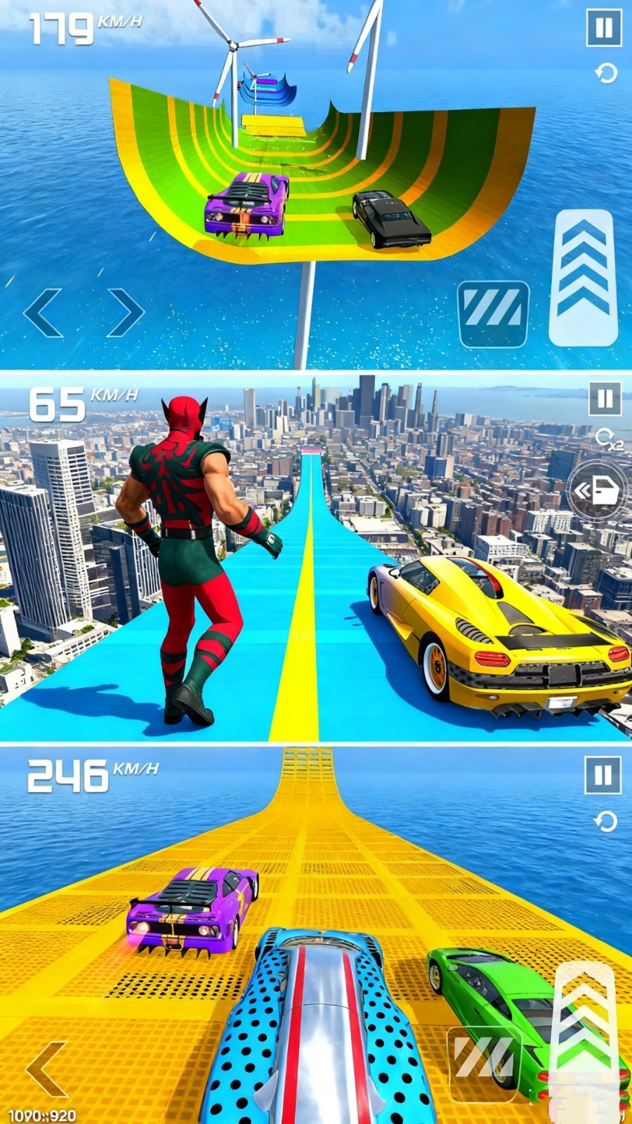 2、特技赛道中设置多种动态障碍与互动元素,驶过加速带能获得短时加速,借助弹跳板可跳至更高赛道层。
