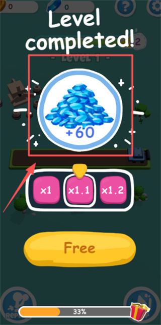 3、结算界面会出现黄色Free免费奖励框,提供x1/x1.1/x1.2三种倍率选择,确认选择后即可获得对应数量的宝石奖励(如+60宝石)。
